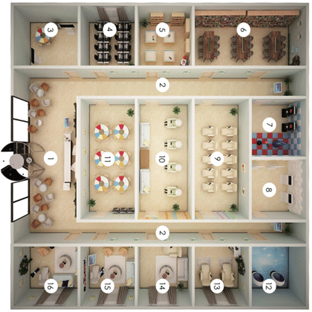 | 7.團體活動室 | 針對(duì)某一共性心理問題進(jìn)行遊戲輔導、藝術輔導等室内團體活動輔導的場所 | 團體活動箱、情景劇活動箱、藝術活動箱、團體活動桌椅、團體輔導管理系統、心理學(xué)挂圖等 |