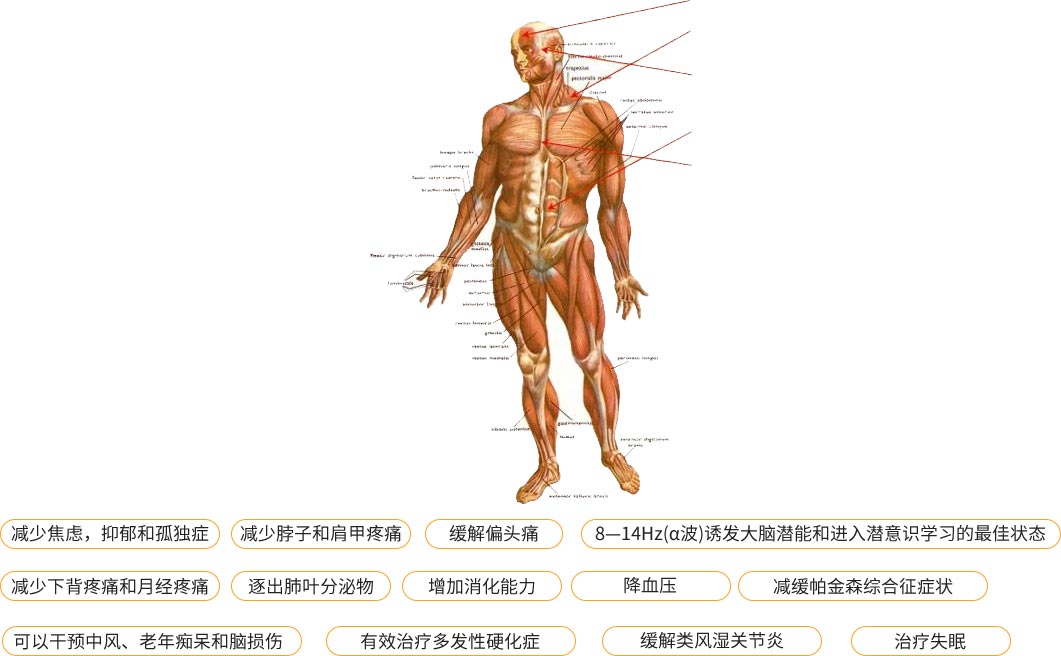 04.有氧運動與被動運動:活化神經(jīng)引起(qǐ)肌肉伸縮,産生一種(zhǒng)理想的、溫和的和有氧的運動效果,緩解疲勞和治療周圍神經(jīng)損傷及癱瘓。尤其适合長(cháng)期高強度對(duì)抗訓練(如運動員、武警、飛行員等),以及鍛煉受場地、年齡、身體條件等限制人群(如産婦、老人、病殘、機艙宇航員等) 人體中的器官組織細胞、血管神經(jīng)經(jīng)脈、乃至蛋白質大分子、各種(zhǒng)酶及DNA、RNA,均有各自固有的振動頻率,其頻率大都(dōu)在100Hz以下的低頻部分。隻有當體感音樂給予人體16-150HZ的重低音域振動能(néng)量時(shí),才能(néng)通過(guò)經(jīng)絡、骨骼傳導,與人體細胞發(fā)生廣泛的“同頻諧振”現象,實現讓身體來“聽”音樂的目的。